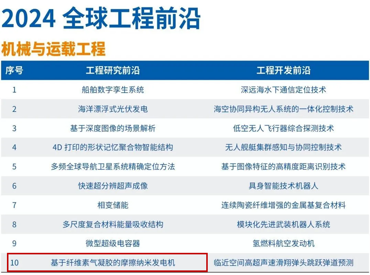系列研究成果近三年以永利集团3044为唯一通讯单位在Nature Communications、Advanced Materials、Advanced Functional Materials、ACS Nano、Nano Letters、Materials Today、Nano-Micro Letters、Nano Energy等材料领域国际顶尖期刊上发表学术论文100余篇。基于上述基础研究,永利集团3044团队领衔的“基于纤维素气凝胶的摩擦纳米发电机”研究方向被列入中国工程院《全球工程前沿2024》报告中的机械与运载工程领域前10大工程研究前沿。