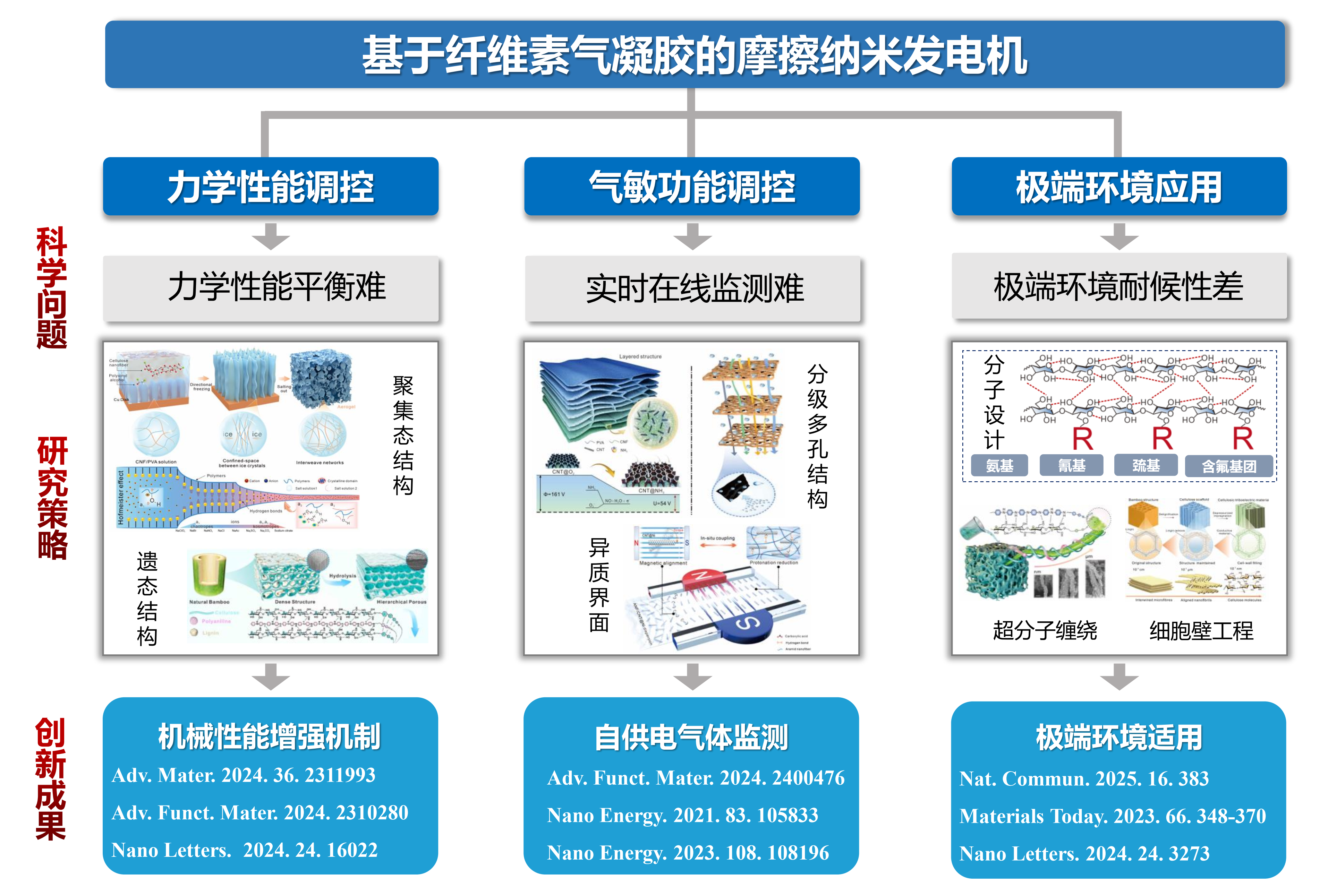 近年来,“先进木质纤维材料”课题组在聂双喜教授带领下,围绕纸基功能材料构筑与先进应用开展系统性基础研究,提出了“基于纤维素气凝胶的摩擦纳米发电机”研究方向,解决了传统摩擦电材料恶劣环境耐候性差、功能单一和力学性能提升难的瓶颈问题。通过纤维素气凝胶聚集态结构调控、木材遗态结构的界面工程等策略,解析了纤维素分子间作用力与机械性能的构效关系,阐明了纤维素摩擦电气凝胶的能量耗散机制,突破了材料轻质与高刚度不可兼得的难题。通过异质界面工程、分级多孔和自组装等策略,成功赋予纤维素气凝胶气敏性功能,实现了氨气、水蒸气等气体的原位实时监测。通过纤维素的分子设计、细胞壁工程、超分子缠绕等策略,显著提高了纤维素摩擦电气凝胶的阻燃性能、热稳定性、耐水性能,实现了高温、高湿、强光照、低温和有毒气体等极端环境下的有效应用,突破了常规材料在极端环境下性能失效的难题。