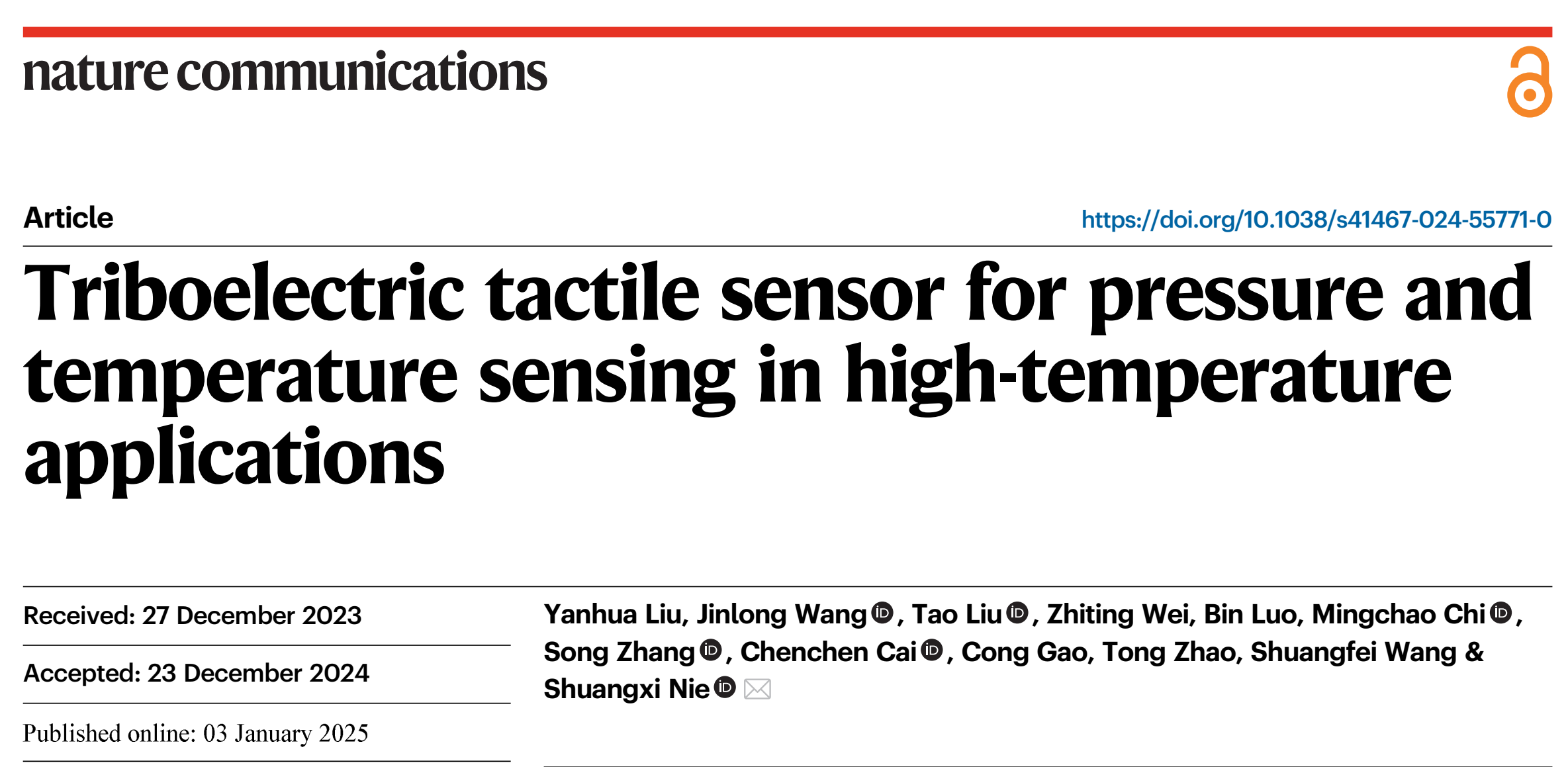 近日,我院“先进木质纤维材料”课题组在纸基功能材料领域取得重要进展,研究成果以“Triboelectric tactile sensor for pressure and temperature sensing in high-temperature applications”为题发表于国际顶级学术期刊Nature Communications上。论文的第一作者为2022级博士研究生刘艳华,通讯作者为聂双喜教授,永利集团3044为该论文唯一完成单位。该成果是“先进木质纤维材料”课题组研究生以第一作者身份继2022年以来在Nature Communications、Advanced Materials等国际具有重要影响力期刊上发表高水平研究成果的又一重大突破,标志着课题组在基础科研团队建设及研究生培养质量上的举措初显成效。