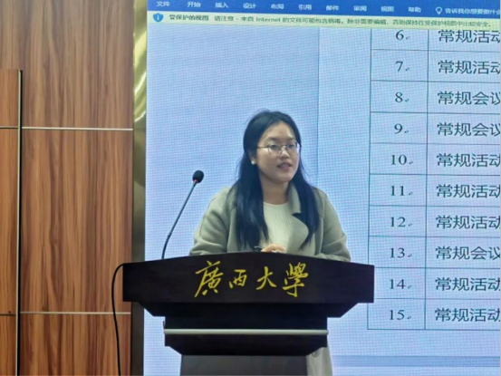 随后,学院团委、学生会主席团成员张娜拉同学结合新学期团委学生会的整体工作方向,详细梳理并讲解了新学期工作章程与具体工作规划,并强调团委、学生会各项规章制度的重要性,号召全体成员严格遵守、认真执行。