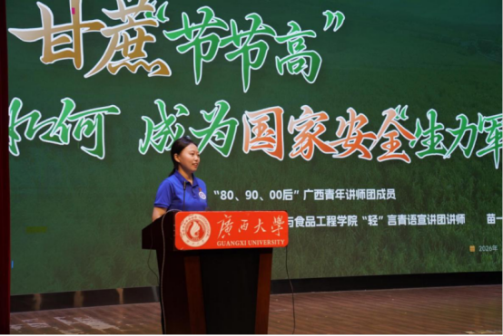 “80、90、00后”广西青年讲师团讲师、我院“轻”言青语宣讲团讲师苗一帆,以“甘蔗节节高,如何成为国家安全生力军”为题开展主题宣讲。她立足制糖工程专业特色,结合自身科研探索与社会实践经历,围绕粮食安全、生态安全、生物安全三个维度展开深入讲解。宣讲以小小甘蔗为切入点,生动阐释食糖安全在国家粮食安全中的重要战略意义,并介绍了学院在绿色制糖、副产品资源化利用等方面的技术成果。整场宣讲将总体国家安全观转化为贴近青年、贴近专业的生动实践,引导同学们立足专业所长守护国家安全,激励大家挺膺担当,以青春之力共筑国家安全防线。